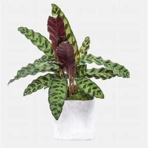 Rattlesnake Calathea Plants have beautifully patterned leaves with purplish/red undersides.  it does well inside in low light areas. Rattlesnake Calathea Plants bring a tropical feel and color to indoor spaces. They are well suited for offices, or areas with only fluorescent light, or even a northern facing window. It is part of the Marantaceae family and likes bright, indirect light, as the colors will fade and the leaves will burn if exposed to too much direct light. Rattlesnake Calathea Plants like to dry out a little bit between waterings.