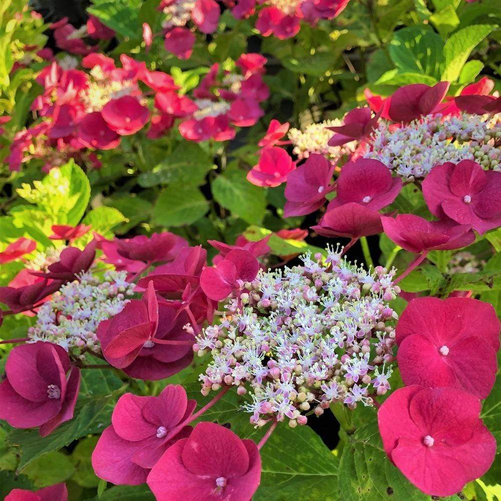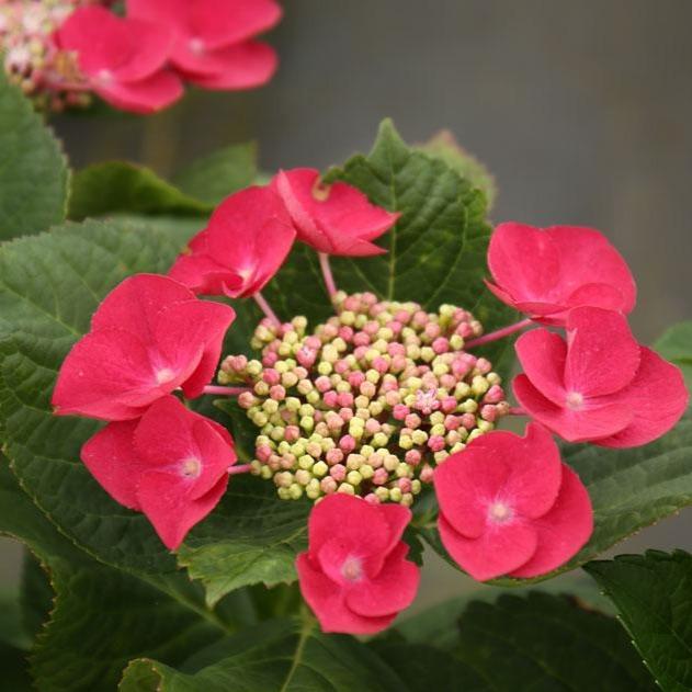 Cherry Explosion Hydrangea (Hydrangea macrophylla 'McKay') are the reddest hydrangea shrubs out there! One of the smallest hydrangeas on the market, it rarely needs pruning. If you're looking for a low-maintenance, compact flowering shrub with lots of color and little hassle, look no further. Cherry Explosion keeps its red color in most soils, developing only purplish centers in acidic soils. The lacecap blooms consist of a mound of cherry-red flowers that last through the entire flowering season, June thru September! Its lush foliage and plentiful blossoms create a stunning summer statement in any garden or landscape. Cherry Explosion Hydrangea Shrubs do well as mass plantings, borders, but its compact size makes it ideal for container plantings as well. Decorate your patio, porch or entryway with potted Hydrangea and take cuttings at the end of the season to enjoy as dried flower arrangements all winter long. Ideal for rustic and cottage gardens, Cherry Explosion Hydrangea is well-loved for its versatility and compact growth habit.