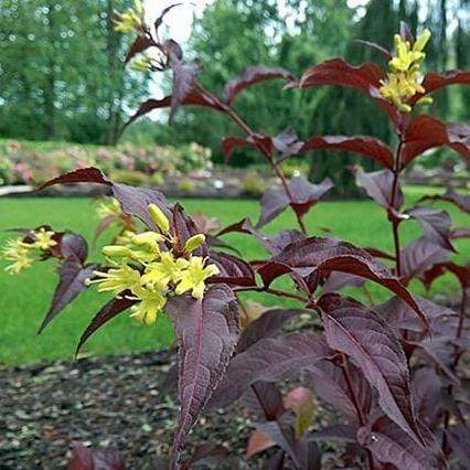 Diervilla Nightglow Shrubs or Diervilla splendens 'El Madrigal' are deciduous shrubs with dark red foliage and striking yellow blooms. Also known as Bush Honeysuckle, Diervilla Nightglow Shrubs' foliage turns an even deeper red during the fall. They are easy to care for and popular placements include walkways, patios, and cornerstones of landscapes.