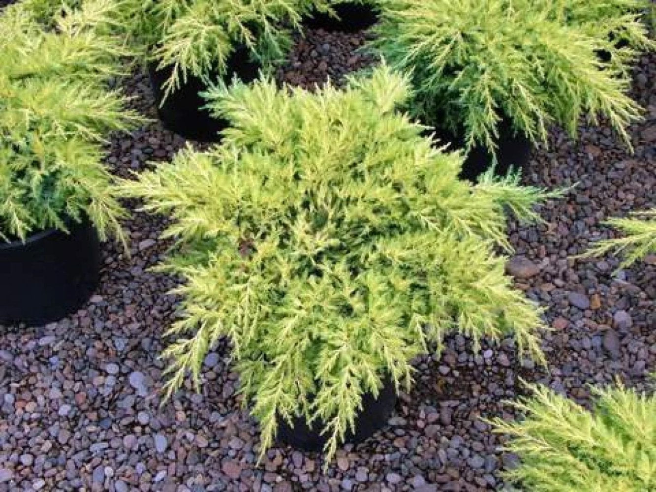 Spreading evergreen Gold Star Juniper Shrubs have blue-green inner branches, with eye-catching golden-yellow outer branches. A colorful accent, border or mass planting.