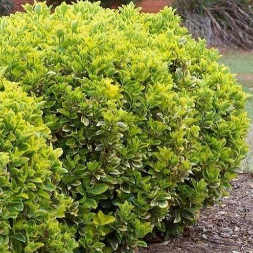 Golden Euonymus Shrubs are an evergreen shrub with large, glossy, oval-shaped leaves that are dark forest green and broadly edged in bright golden yellow.