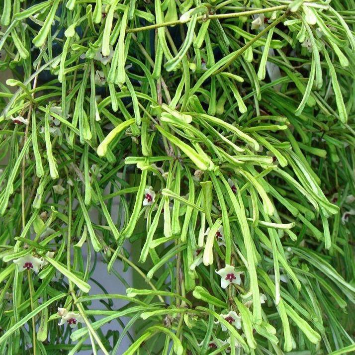 Hoya Retusa (Hoya retusa) is a Hoya plant that produces spindly, waxy leaves and is ideal as a hanging plant. As your Hoya retusa succulent matures, it will bloom white and pink star shaped flowers. From India, this grass-like semi-succulent Hoya will cascade down the edges of a planter or shelf and can grow well past 4 feet long. They love bright light but don’t leave them in direct sun for more than a few hours.