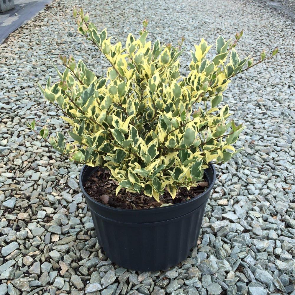 Jack Frost Privet (Ligustrum ‘Jack Frost’) is a striking evergreen shrub with green leaves bordered by lovely cream-white variegation. It is a low maintenance shrub that makes an excellent hedge, privacy screen, or topiary and looks beautiful as an accent in a container or garden. Jack Frost Privet should be trimmed after the last frost but is otherwise extremely easy-to-care-for and beloved by landscapers far and wide. It is a hardy specimen that can grow up to 10 feet and live up to 30 years. When you order your Jack Frost Privet shrub online, you can even use it indoors on a porch or patio. If you choose to plant your Jack Frost in a container indoors, keep in mind it will need more frequent waterings.