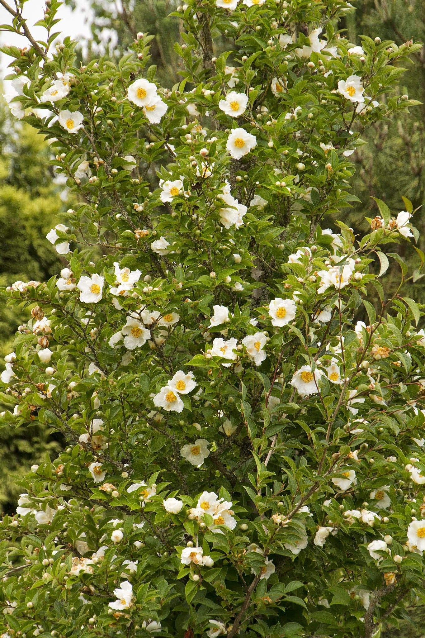 The Japanese Stewartia is truly a one of a kind plant that keeps giving all year round. The camellia-like flower is a bright white with a warm orange center giving it a simple yet eye-catching complement of colors on top of its fresh green foliage. This tree doesn't stop entertaining in the Spring, its dark green leaves become a riot of saturated oranges and flaming brilliant reds in the autumn