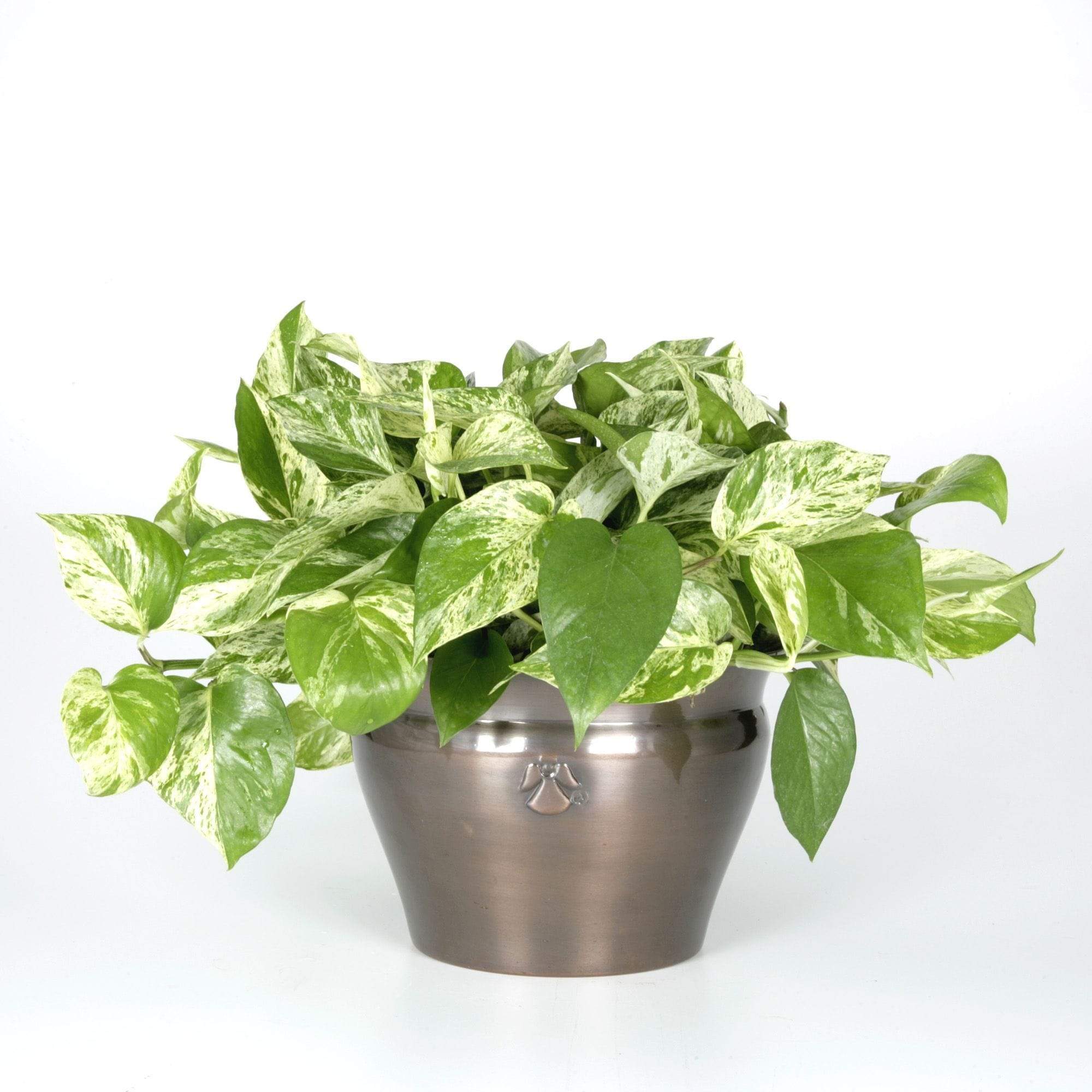 Marble Queen Pothos has a green and white tear-shaped foliage with a tendency to trail and cascade. Also known as Devils Ivy.