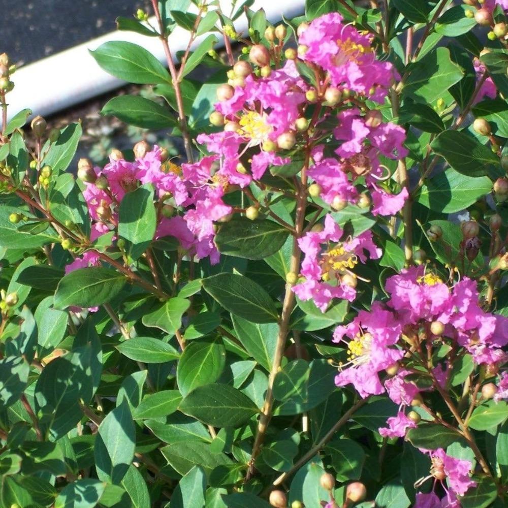 Princess Lyla Crape Myrtle has Rose-pink blooms cover this mounding dwarf Crape myrtle from summer to fall. Foliage is dark green in summer and turns to a flaming gold in fall.