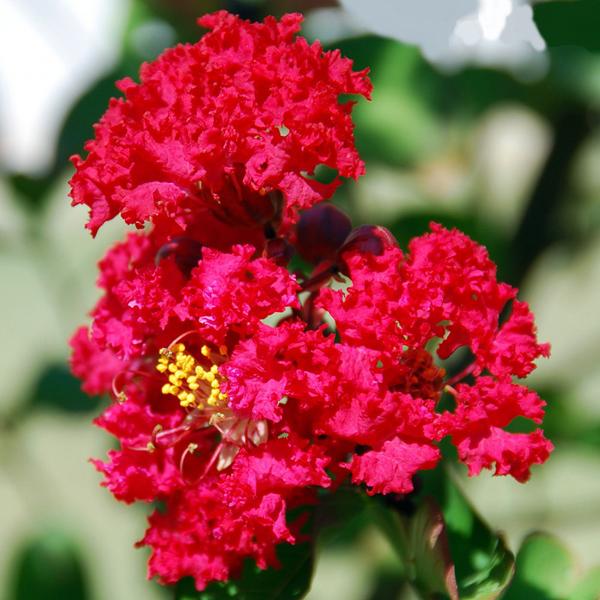 The Crape Myrtle Red Rocket has a very broad and upright growing habit dominated by leaves rounded at the base and grows up to 2 inches long. Each flower cluster can grow up to 2 feet long and produce hundreds of true red blooms. In the fall, their green foliage turns orange-red before falling away for winter. In the same way, its summer bark is almost grey and peels away in the fall to reveal a smooth cinnamon-brown undercoat that shines in the colder months.
